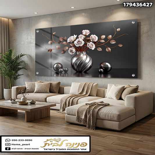 תמונות זכוכית - אגרטל כסף מתפתל עם ורדים לבנים ועלים נחושתיים