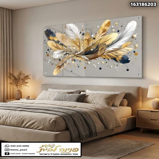 תמונות זכוכית - נוצות זהב ולבן על רקע אפור מנוקד